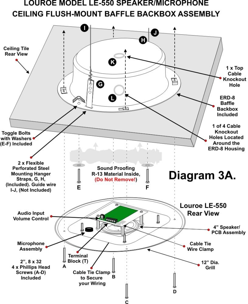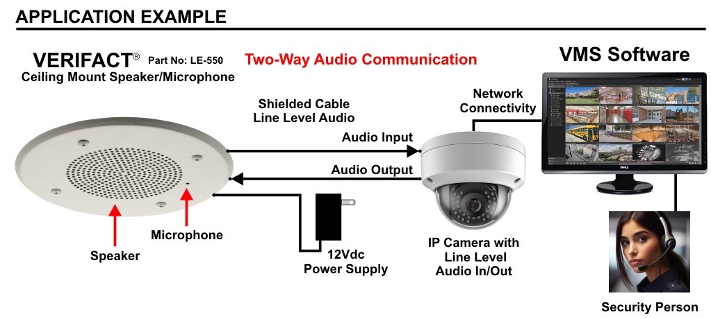 The VeriFact LE-550 is a two-way (talk/listen) speaker microphone. It is a flush-mount ceiling 2-way speaker microphone designed to interface with various modes of audio/video transmission systems (NVR, IP Camera, Encoders) hardware. It includes a Louroe BR-4WS white aluminum grill and a Louroe ERD-8 stainless steel ceiling mount back box, (Included). For surface mount ceiling/wall applications, refer to the Louroe model VeriFact Model LE-555.